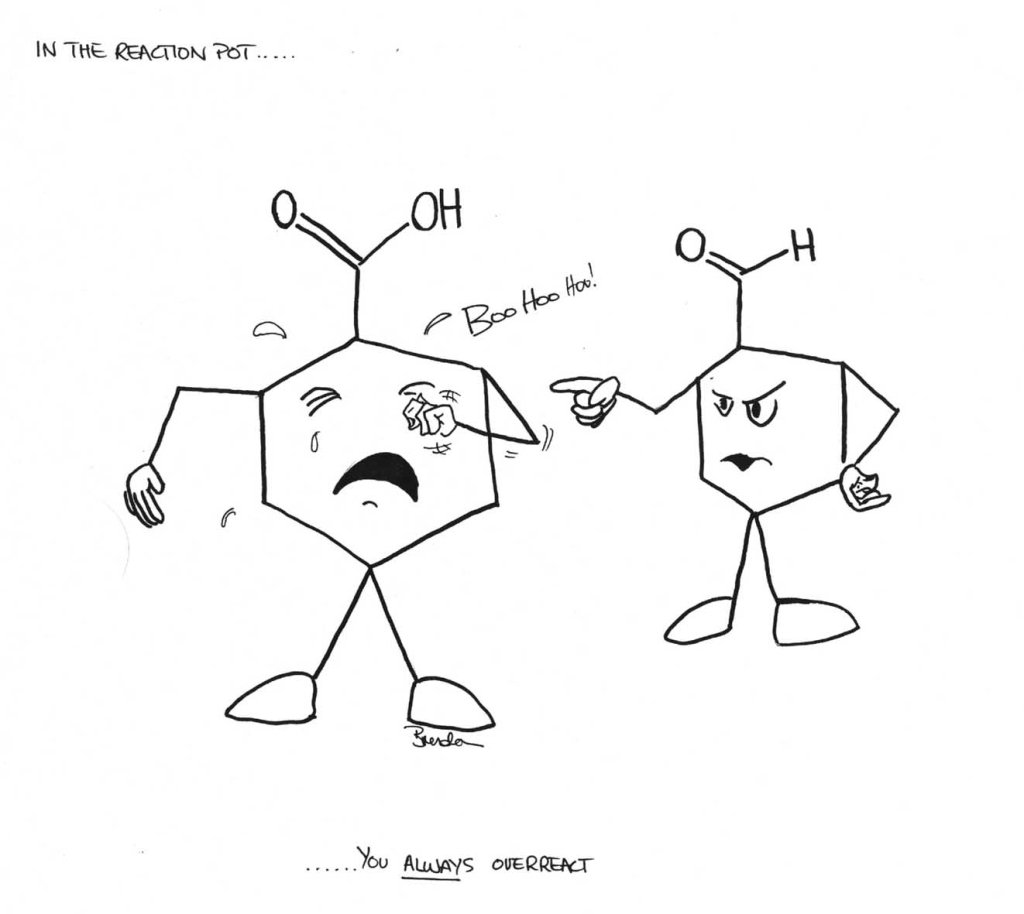 Back in the early 2000s, ChemScrapes was in its infancy. The current style had yet to be developed and the drawings were messy, as opposed to scrappy. By messy I mean there was no concept of how to frame a cartoon. Early drawings suffered a lot from trying to put in too much detail, or none at all. Some examples below are illustrative of these early days.