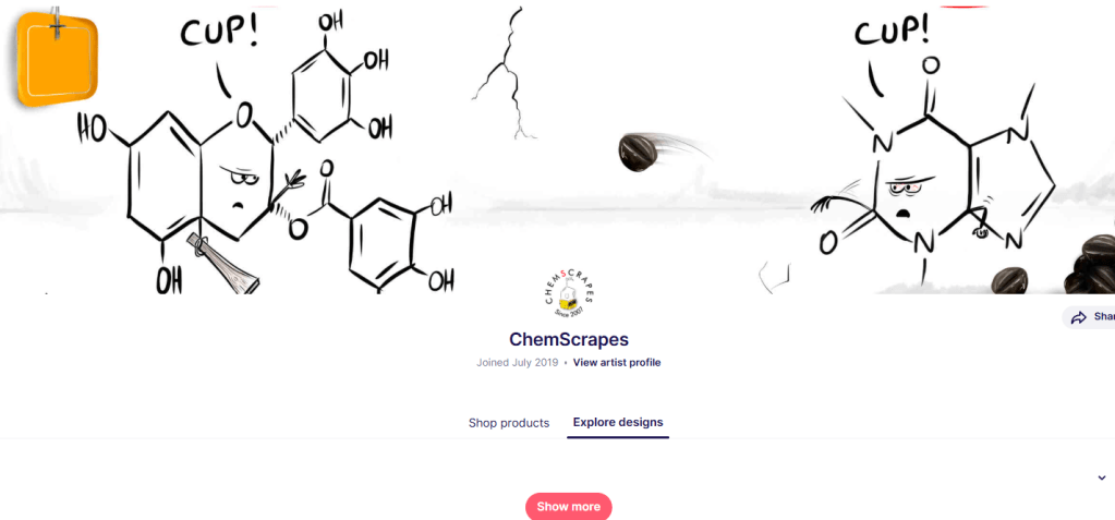 It means the ChemScrapes store is closed until further notice. I’ll take the opportunity to reflect, and consider how I want it to be run. $15 a year suggests something is not quite right with the current endeavour. So I will be attempting to do some market research through ChemScrapes social media channels. If you are reading this, please also feel free to leave thoughts below in the comments section about the types of merch that would speak to you (greeting cards? mugs? stickers? t-shirts?).